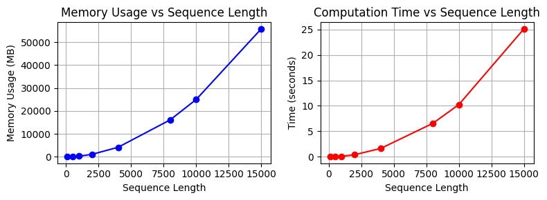 for seq_len, mem, time_taken in results: