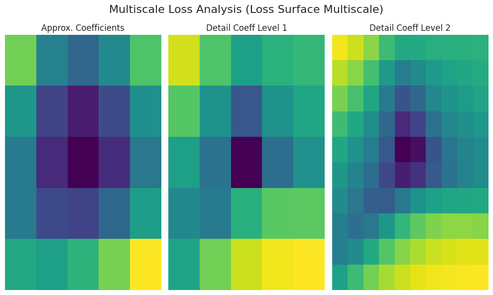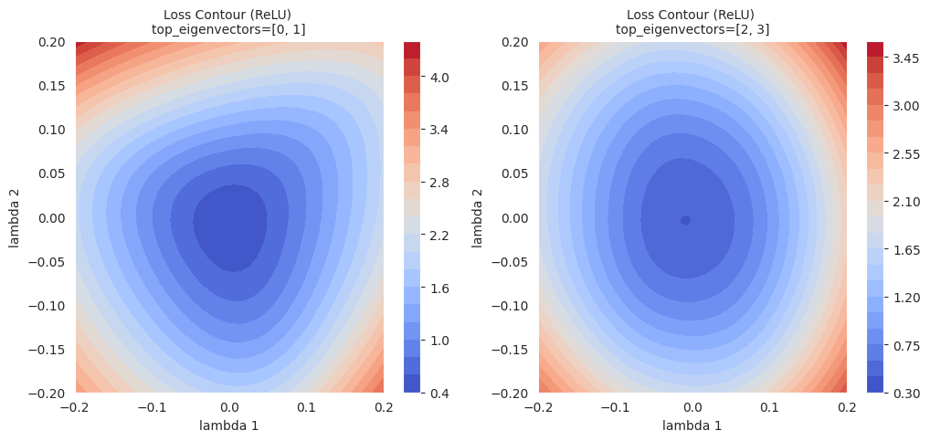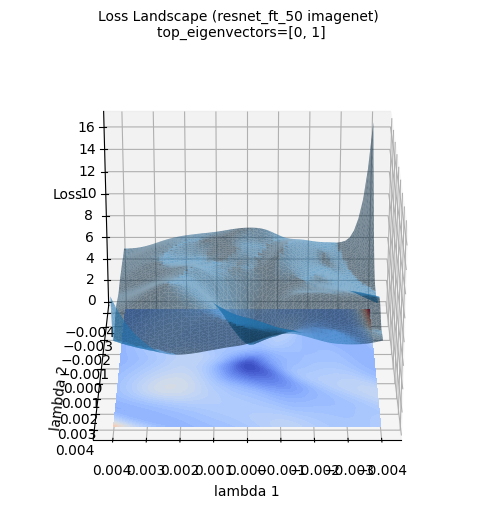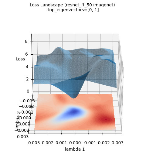 위 손실평면 이미지는 ImageNet 데이터셋으로 신규 학습한 ResNet-50 모델의 손실 표면을 3차원으로 시각화한 것입니다. (PyHessian을 사용하여 계산된 헤시안 행렬의 상위 고유벡터 두 개를 축으로 사용). 가우시안 함수 근사와는 달리, 실제 딥러닝 모델의 손실 표면은 훨씬 더 복잡하고 불규칙한 형태를 띠고 있음을 알 수 있습니다. 그럼에도 중심부(파란색 영역)에 최솟값이 존재한다는 큰 경향은 유지함을 알 수 있습니다. 이러한 시각화는 딥러닝 모델의 실제 손실 표면이 얼마나 복잡한 지형을 갖는지, 그리고 왜 최적화가 어려운 문제인지에 대한 직관적인 이해를 돕습니다.